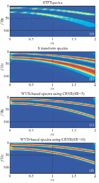 第二个标准测试模型来源于Liu等(2011)和Fomel(2013),其包含两个非稳态的频率呈抛物线变换的鸟鸣信号,如图 4所示.图 5为WVD和SPWVD谱分解结果,其中SPWVD时间和频率窗函数大小取不同值.在图 5b、5c和5d中,SPWVD谱分解时间和频率窗函数大小(采样点数)分别为TW=25、FW=25,TW=25、FW=35,TW=55、FW=45.图 6为STFT、S变换和本文方法得到的谱分解结果.结果如第一个测试例子一样,本文方法得到的谱分解结果显示线性频率分布趋势有较高的分辨率同时不存在交叉噪声.WVD、STFT和S变换方法有各自的缺点如WVD存在交叉噪声,STFT和S变换在低频率成分有较高的分辨率,在高频率成分分辨率下降.从图 5、图 6c和图 6d可看出,尽管SPWVD方法得到的谱分解分辨率比本文方法高,但SPWVD需要选择恰当的时间和频率窗函数.