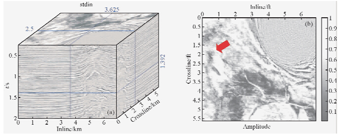 ![]() | 图 7(a)3D墨西哥Gulf地震数据体(b)水平时间切片.蓝线表明纵测线、联络测线、水平切片位置Fig. 7(a)3D seismic image from Gulf of Mexico and (b)the time slice. Blue lines identify the location of inline,crossline sections and time slice |