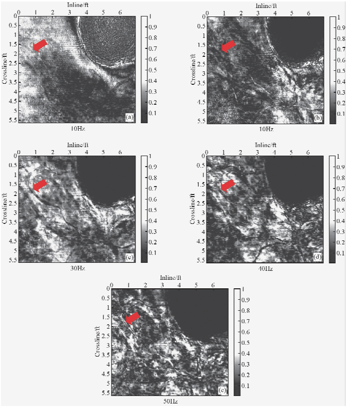![]() | 图 8 谱分解切片(a)10 Hz(b)20 Hz(c)30 Hz(d)40 Hz(e)50 Hz.通过比较,我们可发现不同频率切片对河道有着不同程度刻画Fig. 8 Spectral decomposition slices with(a)10 Hz(b)20Hz(c)30 Hz(d)40 Hz(e)50 Hz. With careful comparison,we can see different time frequency slice displays some clearly visible channels |