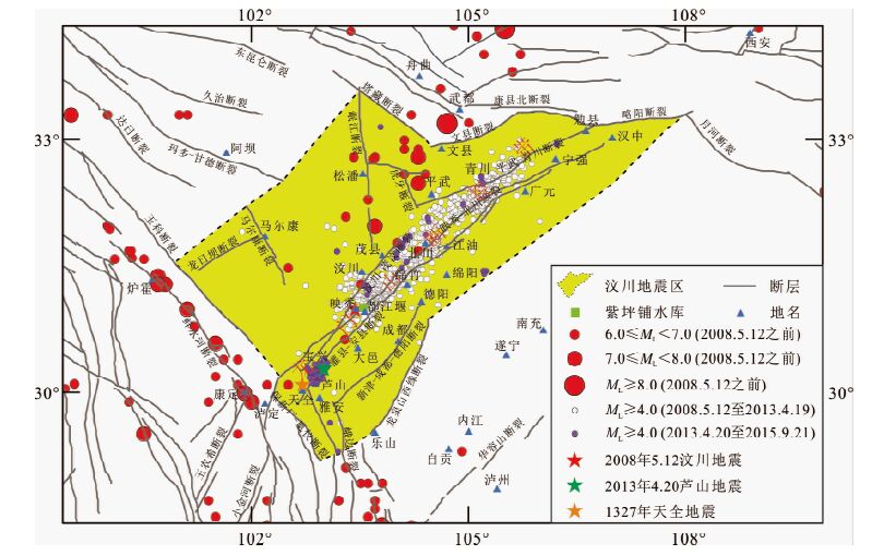 然而,2008年和2013年在龙门山断裂带的中段和西南段,先后发生5.12汶川MW 7.9级地震(美国国家地震信息中心(NEIC)测定值)和4.20芦山MS 7.0级地震(中国地震台网中心(CENC)测定值),其地震活动性骤然呈现频度高、强度大特征,由此引发若干备受学者和社会关注的热点问题,如龙门山断裂带的发震潜力有多大?8.0级左右地震复发间隔有多长?紫坪铺水库是否诱发了5.12汶川大震?围绕上述科学问题,前人已开展了诸多研究,下面作一简要评述.