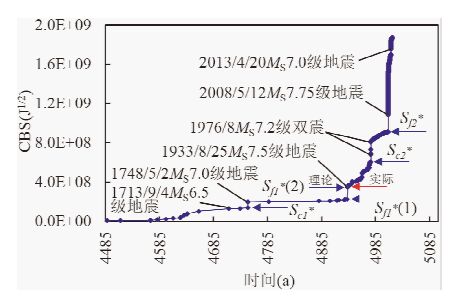 根据图 2所示汶川地震区第2孕育周期标志性地震事件之间的力学联系,可知导致汶川大震发生的直接导火索是1976年松潘-平武双震事件.换言之,1976年松潘-平武双震的发生已决定了汶川地震区第2孕育周期必然会发生一次MS 7.75级的主震事件,与修建紫平铺水库无因果关系.从图 2可看出,自1976年松潘-平武双震发生后,至2008年汶川大震前,汶川地震区CBS值变化速率处于平稳状态,未观察到紫平铺水库蓄水对锁固段破裂起到加速作用,故可忽略紫平铺水库蓄水对汶川大震发震时间的影响;汶川地震区第1和第2轮孕育周期主震事件均为MS 7.75级,可认为紫平铺水库蓄水也未影响到第2孕育周期主震事件震级.
