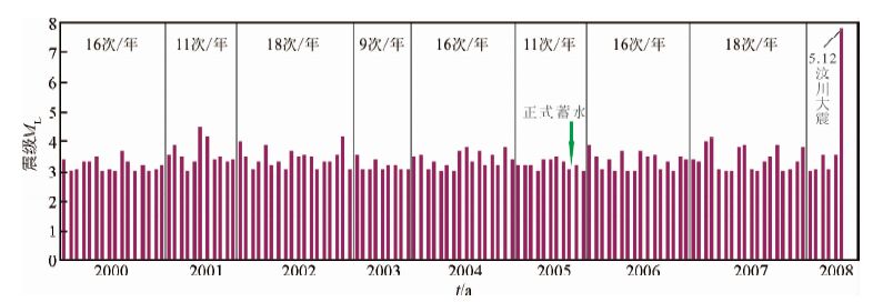 毋庸置疑,答案是肯定的.由于库区蓄水会略微影响周边地区渗流场和应力场,故库区附近断层活动性及地震活动性必然会有某种程度响应.某些学者的研究也证实了该观点,如胡先明等(2009)和卢显等(2010)通过分析紫坪铺水库专用台网所测地震记录,利用库区附近3.0级以下地震目录进行统计分析,认为库区断层活动性和小震活动性与库水位存在一定相关性.作为对比,我们以2000年1月1日至2008年5月12日汶川大震前,汶川地震区ML≥3.0级地震序列作为研究对象,分析了M-t关系和年频次(图 3).可看出,紫坪铺水库蓄水前后汶川地震区ML≥3.0级地震的活动强度和频度并无显著变化.综上可知,紫平铺水库蓄水对地震活动性的影响仅局限于库区附近,且主要对ML<3.0级地震事件产生影响.