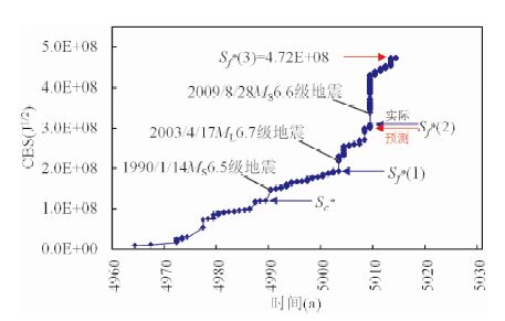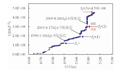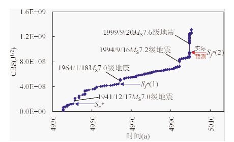 图 7b示出了该地震区第2孕育周期经误差修正后标志性地震事件之间的力学联系.需说明的是,对1999年台湾南投大震,CEDC给出的震级值为MS 7.0级,宋治平等(2011)给出的震级值为M7.7级,美国国家地震信息中心(NEIC)给出的震级值为MS 7.7级.根据秦四清等(2014d)提出的地震参数修订原则,认为1999年南投大震为MS 7.6级合理.根据1941年12月17日台湾嘉义MS 7.0级地震发生前的CBS值,可较准确地连续预测到1964年1月18日高雄MS 7.0级地震与1999年9月20日南投MS 7.6级地震的临界CBS值.假设该MS 7.6级地震为主震事件,则主震与余震释放能量之和约为2.10E+16J, 与震前该地震区积累能量(2.14E+16J)基本相当,故可判断该MS 7.6级地震是主震事件.需指出的是,1994年9月16日台湾海峡MS 7.2级地震,是主震前的一次显著性preshock事件.