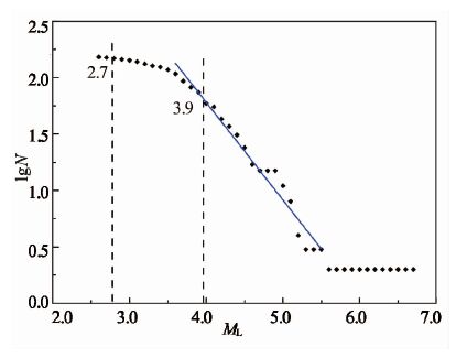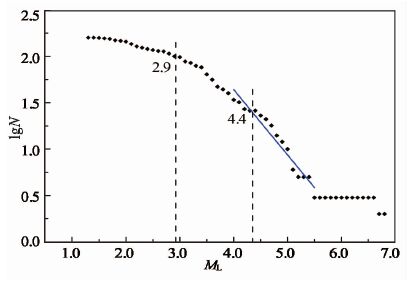 我们对震例的分析表明,一般可选取第1个锁固段膨胀点(Sc)与峰值强度点(Sf (1))之间的地震目录进行分析,确定最小有效性震级Mv.若Sc~Sf(1)之间数据较少,可选取Sc~Sf(2)之间的地震目录确定Mv.如此,可依次类推.