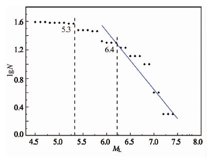 图 6a示出了该区第1周期的震级-频度关系,根据上述方法得出Mv值为ML 6.0.