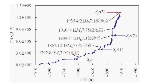 图 6b示出了该地震区第1孕育周期经误差修正后标志性地震事件之间的力学联系,根据1792年8月9日台湾嘉义MS 7.0级地震发生前的CBS值,可较准确地连续预测到基隆东北海域1867年12月18日MS 7.0级地震与1910年4月12日MS 7.75级地震的临界CBS值.对1910年大震,宋治平等(2011)给出的震级值为mB7.75级,国际地震中心(ISC)给出的震级值为MS 7.8级,根据秦四清等(2014d)提出的地震参数修订原则,认为该震为MS 7.75级合理.如此,假设该震是主震事件,则主震与余震释放能量之和约为4.00E+16J, 略低于震前该地震区积累能量(约为4.14E+16J),推测是由于该区1910年大震前某些地震事件震级测定值精度偏低所致,故可判断1910年大震为主震事件.需指出的是,1909年4月15日台北MS 7.3级地震,是主震前的一次显著性foreshock事件;1935年4月21日台中MS 7.1级地震是主震后的一次大余震事件. 该余震发生后,标志着该地震区第3锁固段已发生宏观破裂.