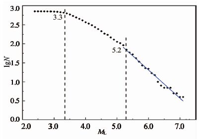 G-R关系中b值本质上反映岩石介质的非均匀性特征,是表征地震活动性分维的指标(蒋海昆和刁守中,1995),其值可利用无标度区间线性段的斜率确定(闻学泽等,2007).我们认为,对特定地震区进行数据处理时,G-R关系无标度区间的下限值Mv可作为提取锁固段本身破裂信息的阈值,并定义为最小有效性震级.