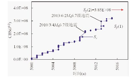 图 2 乌兰-大柴旦地震区1964.3.16-2014.3.12之间CBS值与时间关系(第2孕育周期) (横坐标对应的时间减去3000年为实际年份;误差修正已被考虑) Fig. 2 Temporal distribution of CBS in the period from 16 March 1964 to 12 March 2014 for the Wulan-Dachaidan seismic zone(2nd seismogenic period) (The real time is the value on the horizontal axis minus 3000 years. The error correction is also considered.) |