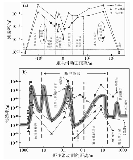 图 1 典型的断层带渗透性结构 (a)汶川地震断层带渗透性结构(据陈建业等,2011);(b)日本中央构造带渗透性结构(据Wibberley and Shimamoto,2003) Fig. 1 Typical fault zone permeability structure (a)Permeability structure of Wenchuan earthquake fault zone(Chen et al.,2011);(b)Permeability structure of Median Tectonic Line of Japan(Wibberley and Shimamoto,2003). |