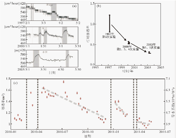 2.2 断层愈合在震后及间震期内,由于流体的作用,同震破裂产生的裂隙可能会逐渐愈合,并且随着裂隙的逐渐愈合断层带的渗透性也随之改变. 近年来,许多科学家开始关注断层带的渗透性随时间的演化过程,期望寻找出震后断层带的渗透性变化规律并对震后断层愈合和地震周期性过程提供约束. 日本1995年Kobe地震之后,科学家们在Nojima断层带上分别于1997年、2000年和2003年进行了三次注水试验(Kitagawa et al.,2002,2007),三次测量到的渗透率均逐渐下降(图 2a,b). 2008年汶川地震以后,科学家们在WFSD-1号孔(Li et al.,2013)内进行了连续的渗透率观测(Xue et al.,2013),检测到了渗透率逐渐下降的过程(图 2c). 这些结果表明震后断层带的裂隙在逐渐愈合,断层强度逐渐恢复.