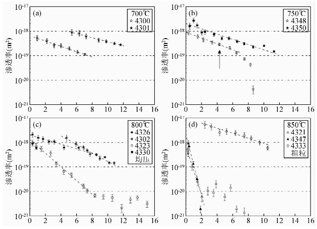 ![]() | 图 3 石英断层泥高温高压下愈合实验结果(据Giger et al.,2007)实验围压为250 MPa,孔隙流体压力为150 MPa,虚线代表拟合结果. 渗透率随愈合时间呈指数衰减关系. Fig. 3 Permeability evolution of quartz gouge as a function of temperature and time(Giger et al.,2007)All experiments were performed at confining pressure of 250 MPa and pore pressure of 150 MPa. The dashed lines indicate the exponential best fit to the relevant data sets. |