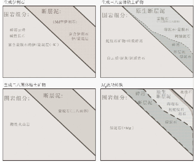 ![]() | 图 5 不同围岩断层带内粘土矿物组合示意图(据Haines and van der Pluijm,2012) Fig. 5 Schematic figures showing clay mineral patterns in fault zone with different wall rocks(Haines and van der Pluijm,2012) |