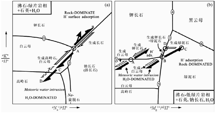 Wintsch等(1995)将花岗质断层带的水-岩反应体系归纳划分为三类: 水控体系,岩控体系和富镁体系,并用流体活度关系图做了描述(图 6). 水控体系中,相对酸性的大气降水渗透到断层带中,会使流体pH值降低,其成分将会落在高岭石的区域内(图 6a),为了达到化学平衡长石将被溶解,并首先沉淀出高岭石,然后是白云母. 这一体系中水/岩比值越大,越有利于上述反应的进行. 在岩控体系中,由于水/岩比值较低,水-岩反应会对流体成分产生较强的影响. 水-岩反应及离子的表面交换会产生碱性氢氧化物和高pH值,这种情况下层状硅酸盐矿物将溶解,并生成长石. 因此随着反应的进行,层状硅酸盐矿物逐渐减少,断裂带岩石的强度将增大. 而在富镁体系中,岩控体系的低级变质组合条件下,钾长石和绿泥石更易于同时沉淀,而在较高级变质过程中,钾长石和绿泥石组合则被白云母和黑云母组合所替代. 因此,在富镁岩石中,无论是水控还是岩控体系,都将有层状硅酸盐矿物不断生成(图 6b). 总结已有研究,断层带内长石蚀变分解形成粘土矿物的流体-岩石反应可能主要包括: