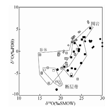 ![]() | 图 7 San Andreas断层带围岩、断层带及脉体的δ13C、δ18O同位素分析结果(据Pili et al.,2002) Fig. 7 Stable isotope compositions(δ13C and δ18O)of veins,fault rocks and host rocks from San Andreas Fault zone(Pili et al.,2002) |