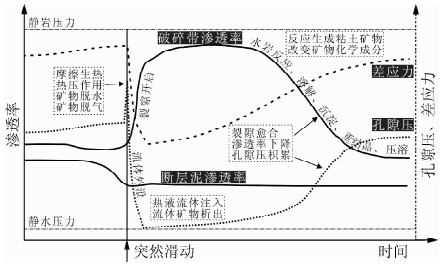1)同震阶段: 快速摩擦升温导致流体产生热压效应,矿物受热分解脱水、脱气进一步提高热压作用强度,造成同震滑动弱化. 另外,同震破碎作用造成断层带渗透性提高,导致流体外泄,震前积累的孔隙流体压力下降.