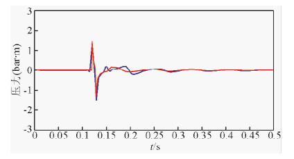 图 5为GI枪子波模型模拟的压力子波(红色)与Sercel公司的实测子波(蓝色)对比.由图可看出,红色模拟子波曲线中,气体喷出时,子波峰峰值达到4.05 bar·m,而实测子波的峰峰值为4.0 bar·m.跟蓝色的实测子波曲线对比,变化趋势基本相同.