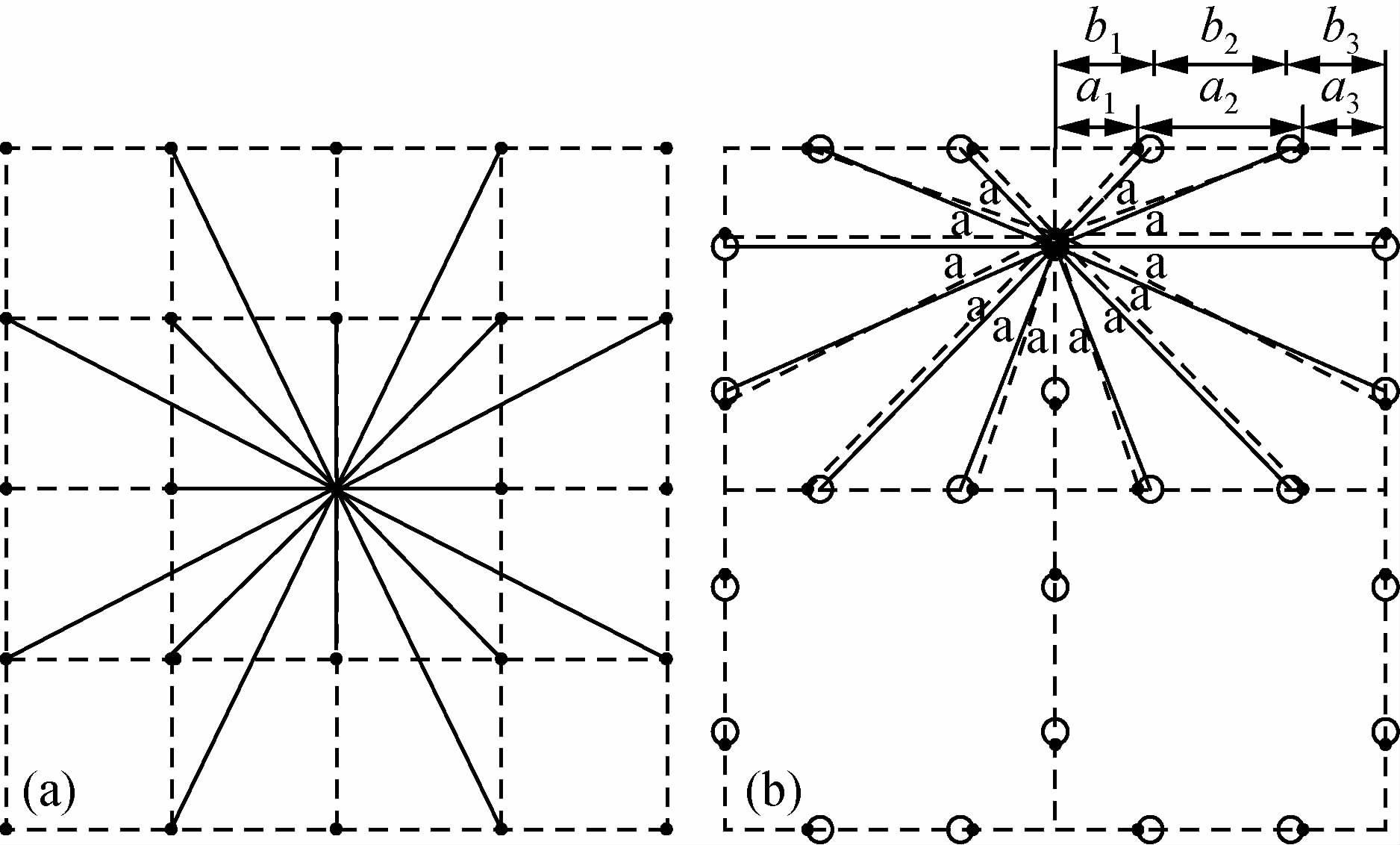 3.3.1 速度模型节点设置及出射射线分布速度模型的节点设置方式有两种:方式一如图 1a所示,节点设置在单元角点,在各个节点设定波速值,每个节点均可与相邻节点相连接.在二维情况下震源点与子波源点间有16个出射方向,三维条件下,射线出射方向达到26个.这种设置能够为绘制走时和速度等值线图提供方便,更重要的是可以引入速度界面,进行反射波的射线追踪(Moser,1991);方式二是在单元的边界上设置规则节点(不包括单元角点),单元内波速设定为常数,节点间不允许穿过单元边界进行连接.这种模型使两个节点之间的走时计算简单而快速,保证了射线追踪在一个单元内的精确性.在该方式中,节点设置有按照等间距分布和等角度分布(震源与边界节点之间的夹角相等)两种选择(如图 1b所示,设d为网格单元间距,实心圆点为等间距分布节点,其中,a1=a3=0.25d,a2=0.5d;空心圆点为等角度分布节点,其中,b1=b3=0.29289d,b2=0.41421d,α=22.5°).对于折射波的计算,后者要比前者减少50%的误差(Zhang and Toksöz,1998;张美根等,2006a).