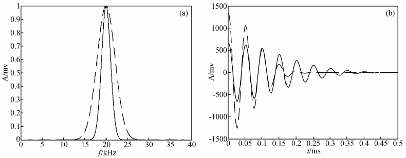图 2是主频相同(20 kHz),带宽不同(b=1500、3000)的两个激发函数及其相应的激发波形,从图 2左图可以看到:虚线的频带比较宽、实线的比较窄;从右图中可以看到:实线共计有7个周期比较清楚,虚线则只有4个周期比较清楚.即频带越宽、激发波形的震荡周期越少;频带越窄,振荡周期越多.