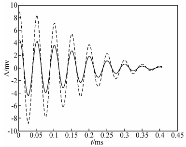 取地层的电导率为2 S/m,相对介电常数为10,相对磁导率为1,井半径为0.051 m.用图 2所示的激发频谱得到的z=0.1 m处的瞬变电磁测井响应波形如图 3所示.其波形形状与激发波形图 2相似,只是整个波形向后移动了π/2.