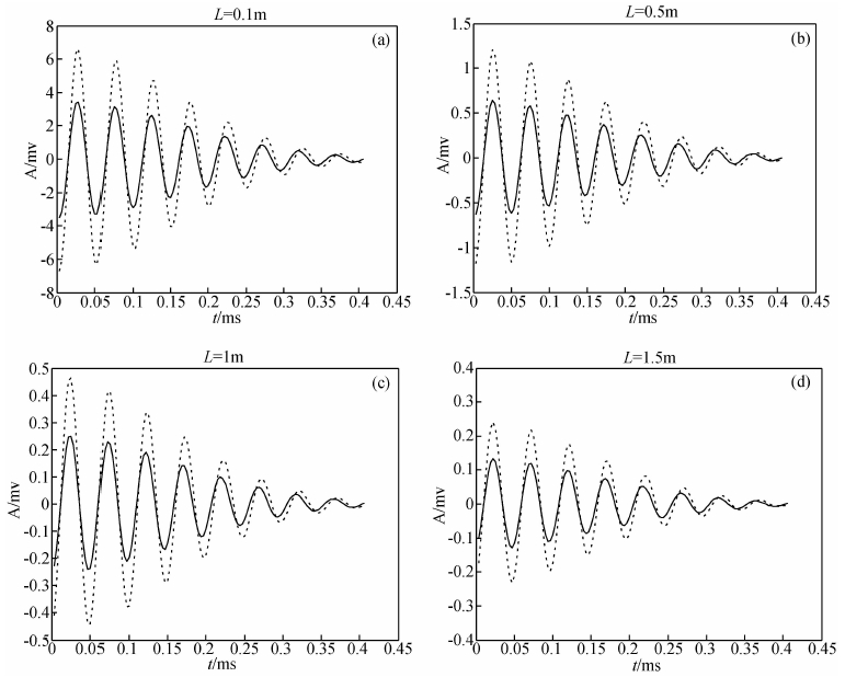 图 7 地层电导率为2 S/m的响应减去地层电导率为5 S/m的响应差(虚线)和地层电导率为2 S/m的响应减去图 6所示地层电导率从2 S/m连续变化到5 S/m的曲线时的响应所得到的响应差(实线) (a) L=0.1 m; (b) L=0.5 m; (c) L=1 m; (d) L=1.5 m Fig. 7 The difference value of response of 2 S/m minus 5 S/m (dotted),2 S/m minus 2 S/m to 5 S/m (solid) in Fig. 6 |