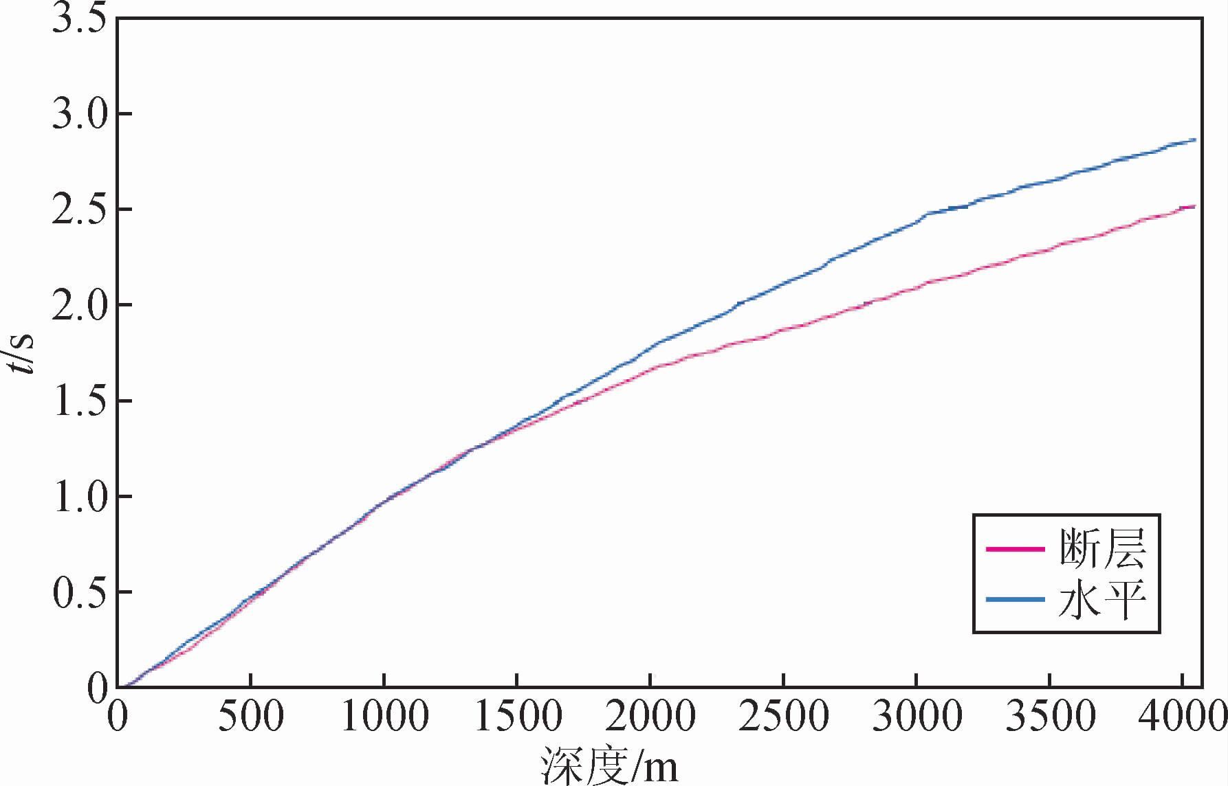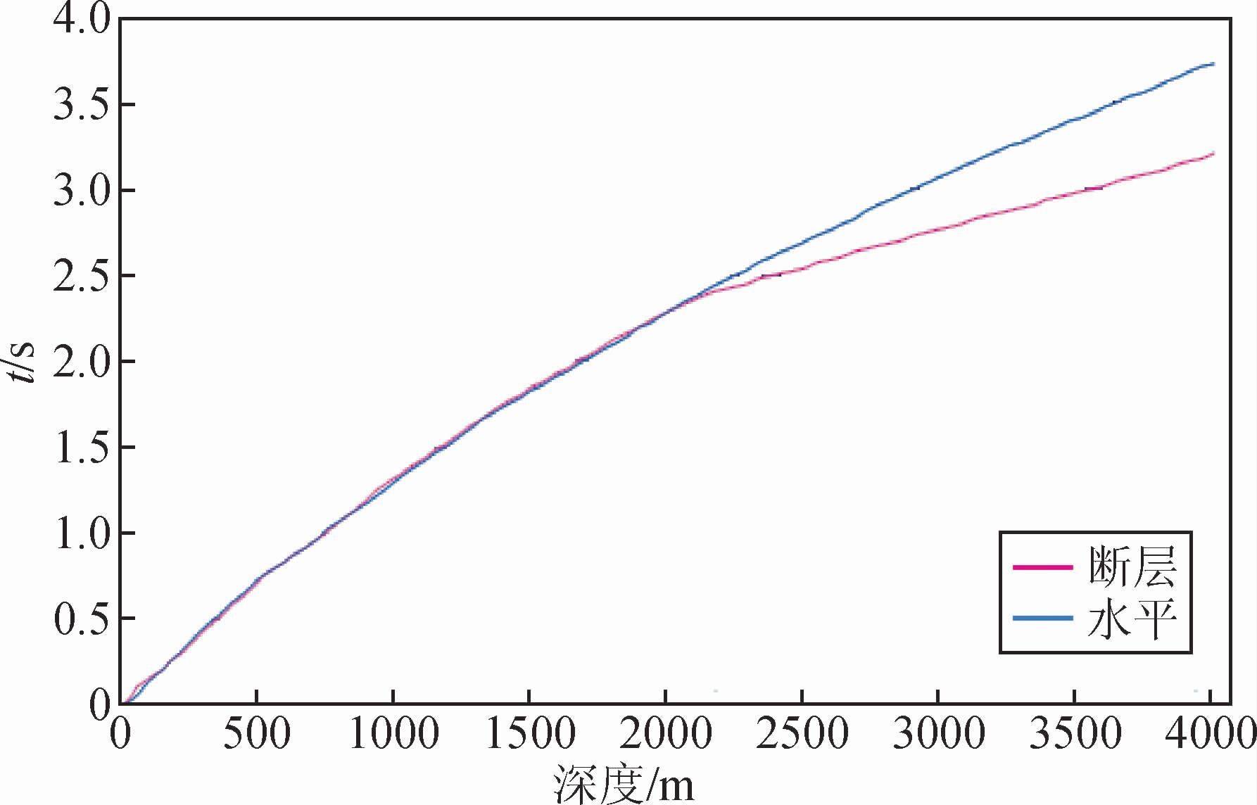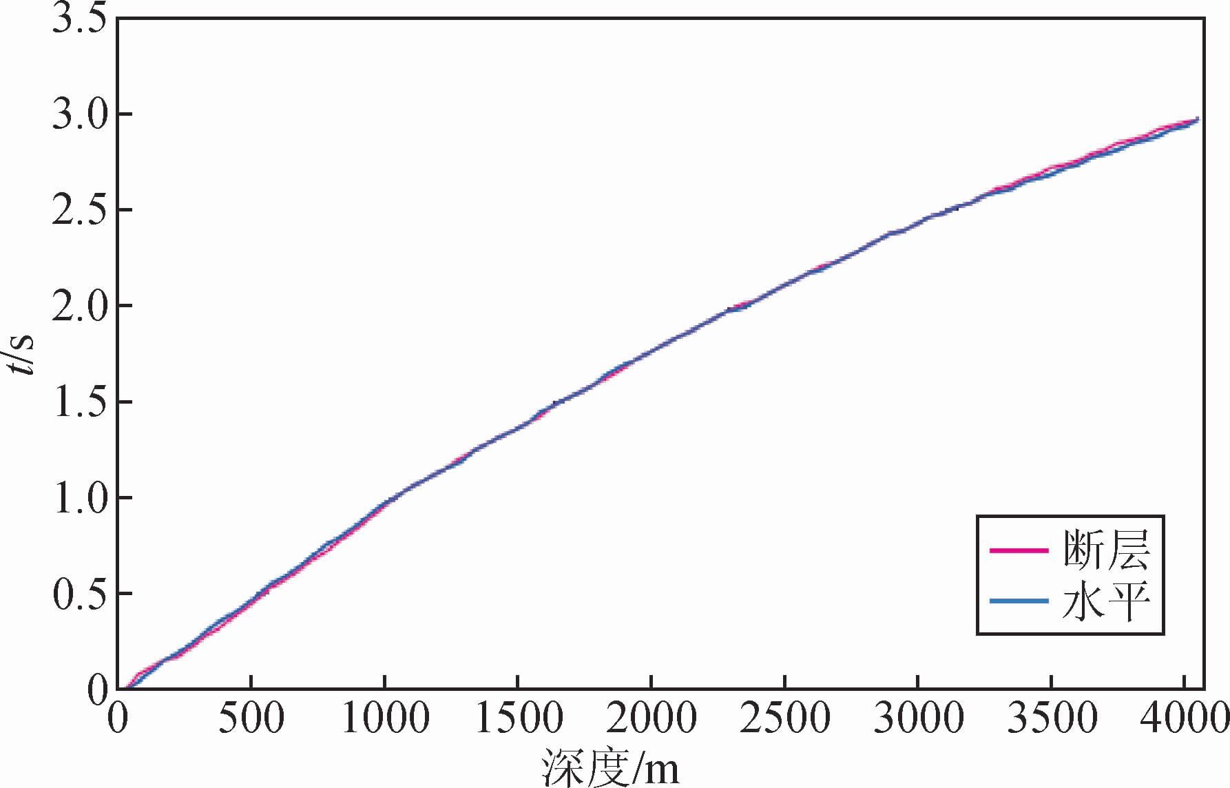 当井位于断层的下降盘,未钻穿断层时,断层下降盘的地层较相同深度的上升盘地层要新,地层速度也相应较小,波在传播时走折线路径的时间大于走深度路径的时间,因此,跟水平地层的情况一样,其时间路径和深度路径也是一致的,不存在VSP时差(图 3).