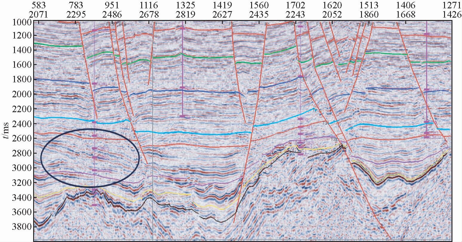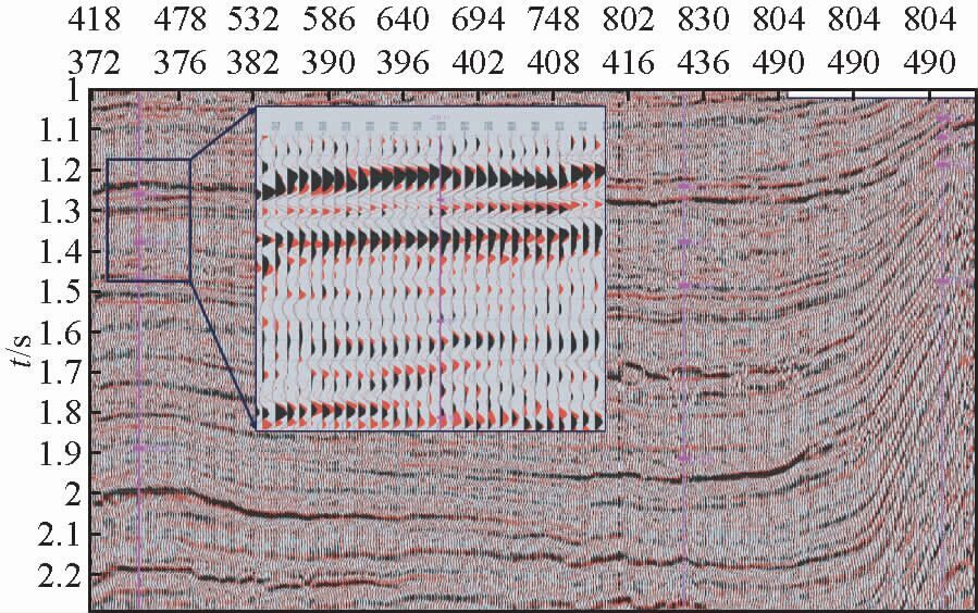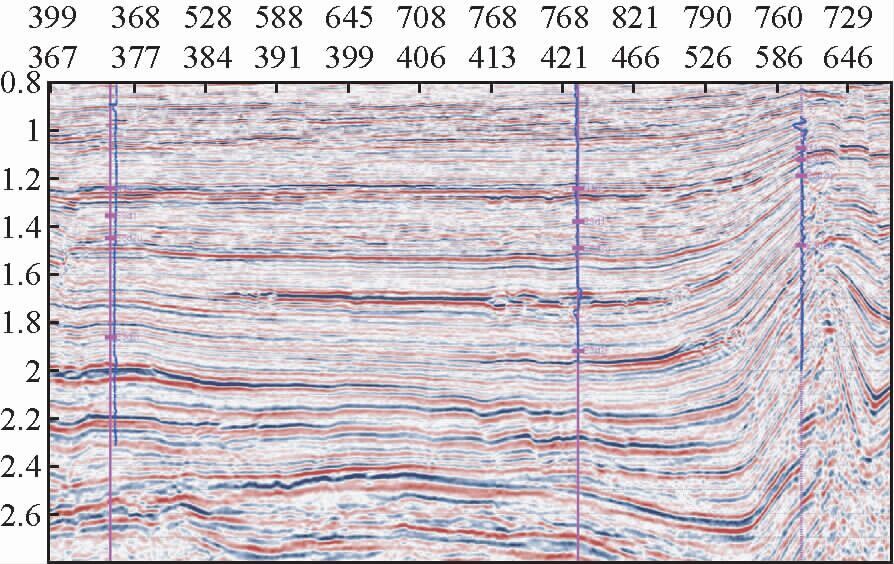 该区地震资料先后在1998年和2005年进行了两次处理.两次处理资料存在时差,在目的层段(1.3~2 s),将老资料上移10 ms并反转极性可与新资料较好的对应(图 15).