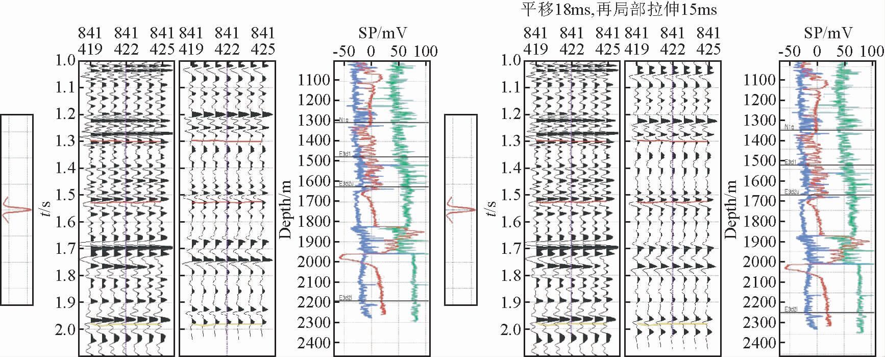在断层和靠近高速地层处,钻穿断层和靠近高速地层的井本身会产生一定的VSP时差.另外,由于断层和靠近高速地层的地层较陡,叠前偏移方法很难准确的归位,也会产生偏移剖面时差,这些地质情况下的调整也主要是以局部拉伸为主.