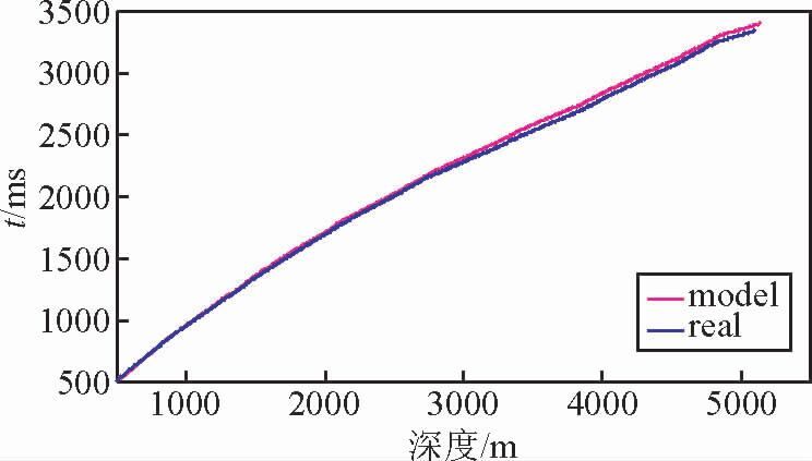 如图 3所示,位于断层下降盘的井,跟水平地层的情况一样,其正演结果和实测结果也具有很好的一致性(图 8),说明位于断层下降盘的井测量的VSP时深关系也是可靠的.