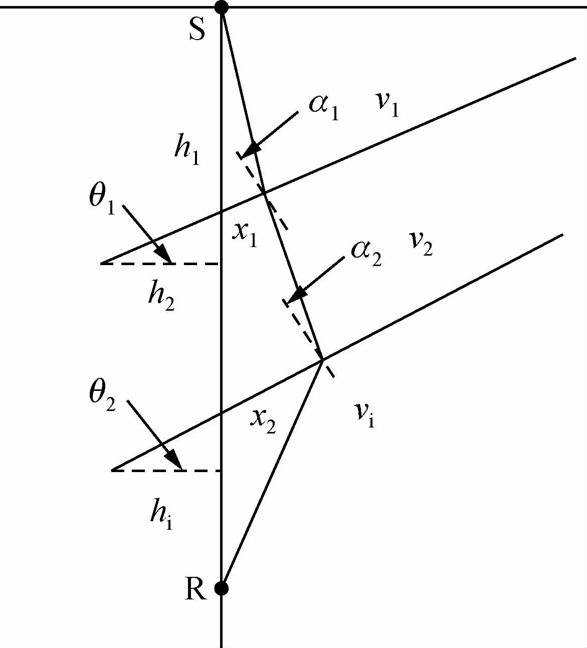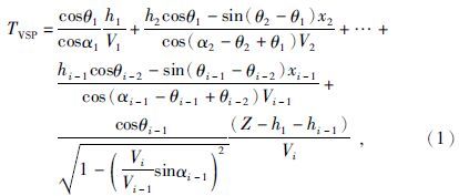 当井钻遇的是倾斜地层时,VSP时间不再沿深度路径传播,而是沿用时最短的折线路径传播,VSP时间不再等同于理论时间.如图 2所示,设倾斜地层的倾角分别为θi(i=1,2,…,n),入射波与地层法向的夹角为αi,入射波到达每个倾斜界面的偏移距为xi,地层的速度为vi,井点处的地层厚度为hi.则在井中海拔深度为Z处,VSP时间计算公式为