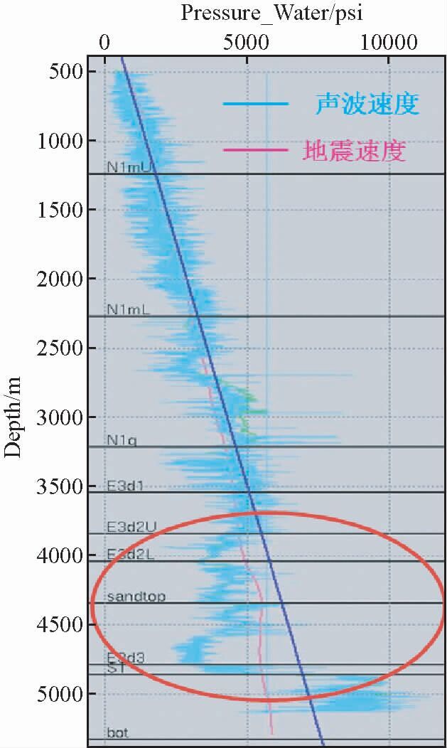 图 20 B-1井地震速度与实测声波速度对比 Fig. 20 Comparison of seismic velocity and measured acoustic velocity in well B-1 |