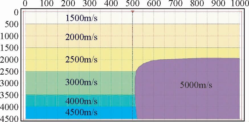 1.2.2 正演模拟为了验证速度不准对成像结果的影响,利用具有一个水平分界面的简单模型进行正演模拟,明确速度不准对成像结果的影响情况并进行分析.如图 12所示,假定初始模型为两层,第一层Vp为2000 m/s,第二层Vp为2500 m/s,密度为1.5 g/cm2.利用原始的真实模型进行正演,获得炮记录.然后利用该炮记录对所有速度模型进行成像.