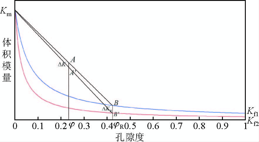 (3)图 1连接过K=Km和点A的直线,并与流体Kf1的Reuss平均曲线相交于B点,B点的孔隙度即为临界孔隙度φR,在B点上下移动,与流体Kf2的Reuss平均曲线相交于B′点;