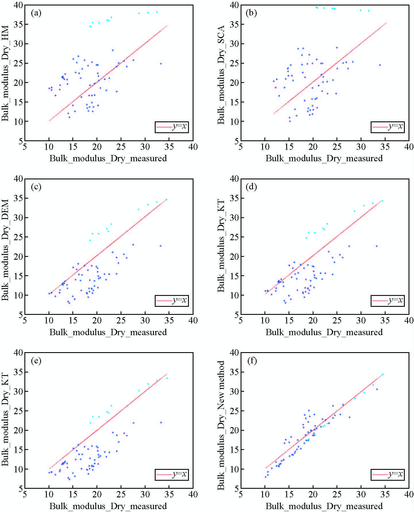 2 实际数据测试应用70块岩样数据对以上的方法的进行测试,首先在实验室中对岩样进行烘干,然后静置一段时间,使孔隙中的流体充分流出,然后用水饱和岩石,测量饱和岩石的纵横波速度,密度数据,计算饱和岩样的体积模量;重复上述步骤,获得干岩石骨架,测量干岩石模量;测量基质模量,将岩石基质模量用于以上方法的计算.将干岩石模量的真实值与各方法的预测结果进行对比,结果如图 2所示,(a)是疏松砂岩模型预测的结果,预测的结果和实际计算的结果相差较大,特别是纯净的砂岩(图中亮蓝色的点),误差较大;(b)是SCA模型预测的结果,孔隙纵横比a=0.3,预测的结果和实际计算的结果相差较大,特别是纯净的砂岩,误差更大;(c)是DEM模型预测的结果,孔隙纵横比a=0.3,预测的结果精度提高,特别是纯净砂岩;(d)是K-T模型预测的结果,孔隙纵横比a=0.3,预测结果比DEM模型结果稍好;(e)改变孔隙纵横比a=0.5,用K-T预测的结果,预测的结果和实际计算的结果线性关系更加好,但是误差还是不能满足要求;(f)用图形解释的方法预测的结果,该结果与实际计算的结果具有很好的关系,两者误差很小,效果很好.