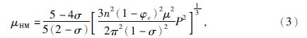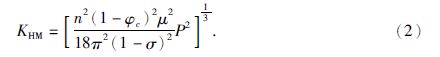 其中,KHM和μHM分别是临界孔隙度φc时干岩石的体积模量和剪切模量;P是有效压力即(围压和孔隙压力之差);μ和σ分别是固体相(基质)的剪切模量和泊松比;n是配位数(每个颗粒接触点的平均数).