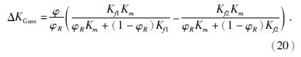 在流体替换后的横波速度未知的前提下,结合方程(13)、(14)、(19)就可以计算在一定孔隙度下,流体替换后饱和岩石体积模量的变化量.公式为