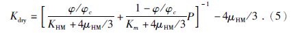 在孔隙度φ时,岩石骨架的比例(加入充填物降低孔隙度)是1-φ/φc,充填物的浓度是φ/φc,干的疏松砂岩混合物体积模量是: