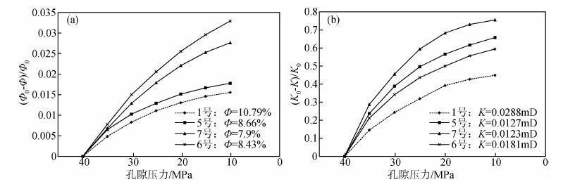 (2) 渗透率“先快后慢”的变化趋势,主要原因为,致密储层吼道主要为微细吼道或者微裂缝,随着储层孔隙压力降低,有效应力作用下岩石首先发生弹塑性形变,使得微细吼道或微裂缝的凸起部分发生闭合,快速的降低储层渗透率;在储层孔隙压力降低到一定程度后,储层的压实程度也就相对较高,所存在的吼道为不易闭合的吼道,储层在有效应力作用下的收缩量也就明显降低,从而使储层渗透率的变化趋于缓慢.