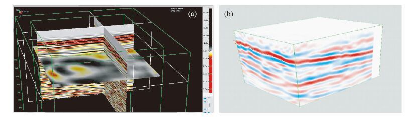 图 12 三维地震资料成果的三维显示 (a)垂直剖面和水平剖面联合显示;(b)立体显示. Fig. 12 3-D seismic data display (a)Vertical and horizontal section;(b)Stereo. |