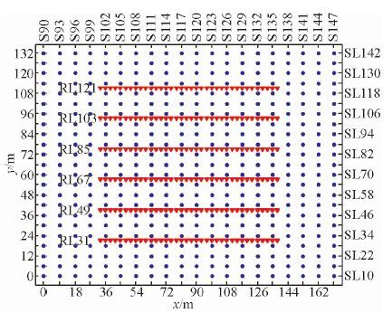 地震线束观测系统是目前三维地震大面积施工中最常用的类型,该系统是由多条平行的接收排列和垂直的炮点排列组成.