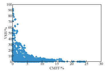 图 7 A井可动流体孔隙度(CMFF)与泥质含量(VSH)关系 Figure 7 Relation of movable fluid porosity (CMFF) versus clay content (VSH) in well A |