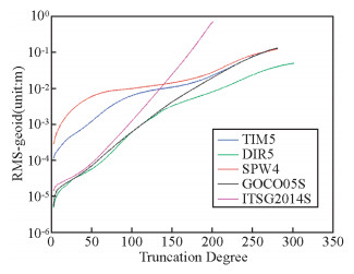 随着新一代卫星重力探测项目CHAMP、GRACE和GOCE的成功实施,纯重力卫星重力场的分辨率和精度也逐步提高.目前,利用2003-2013年间累积124个月的GRACE重力场资料解算的ITSG2014S纯卫星重力场的最高阶次为200阶(Mayer et al., 2010, 2014), 其对应的大地水准面的空间分辨率为100 km.2009年,搭载了重力梯度计的GOCE卫星发射后,获取了对较高阶重力场敏感的重力梯度数据,使地球纯卫星平均重力场模型的精度和分辨率进一步得到大幅提高(Rummel et al., 2010, 2011; Yi et al., 2013).目前公布的由纯重力卫星数据解算的阶次较高的纯重力场模型有GO_CONS_GCF_2_SPW_R4(SPW4)(Reguzzoni et al., 2009; Gatti et al., 2014)、GO_CONS_GCF_2_TIM_R5(TIM5)(Pail et al., 2010a; Brockmann et al., 2014)、GO_CONS_GCF_2_DIR_R5(DIR5)(Bruinsma et al., 2013)、GOCO05S (Pail et al., 2010b; Mayer- Gürr et al., 2015 )和ITSG-GRACE2014S (ITSG2014S)(Mayer et al., 2015)等.图 1给出了多种纯卫星重力场模型不同截断阶次对应的大地水准面的误差,其详细特征见表 1.结合图 1和表 1,可以发现,在中低阶部分(约小于130阶),纯GRACE重力场模型的精度要高于纯GOCE重力场的精度,在中高阶部分(大于130阶),纯GOCE重力场的精度高于GRACE重力场的精度,说明GOCE卫星的贡献主要在于重力场的高阶部分.联合了多种重力卫星观测手段解算的DIR5、GOCO05S重力场模型的精度比纯GOCE、GRACE重力的精度有所提高,尤其是DIR5重力场模型的空间分辨率已提高至300阶,对应的空间分辨率为67 km,由其解算的大地水准面的精度也达到5 cm的量级.