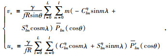 其中,P′ lm为Plm的一阶导数.应用公式(5)在频域内计算地转流,可方便地对地转流进行频谱分析,从而给出地转流的更多细节特征(Albertella等(2012),Jin等(2014),冯贵平等(2014).需要注意的是,由于赤道附近科氏力系数f趋近于0,地转平衡公式存在奇异性,公式4,5不适用于赤道区域地转流的计算.在赤道区域一般采用 Lagerloef等(1999) 提出的方法计算地转流.