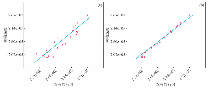 图 6 解释标志层位的深度与时间交会图 (a)井控静校正前的交会图;(b)井控静校正后的交会图. Figure 6 Cross plot with the depth and time of the interpretation marker horizon (a) Cross plot before the constraint-wells static correction; (b) Cross plot after the constraint-wells static correction. |