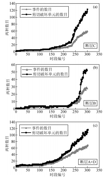 3.1 事件与剪切破坏单元的数目的演变规律图 2a~c分别给出了断层C、B及A+D上事件的数目和剪切破坏单元的数目的统计结果.总体上看,各条断层上事件的数目和剪切破坏单元的数目均随着时段编号的增加而增加,并且各条断层上剪切破坏单元的数目均大于事件的.相对而言,断层C及A+D上事件的数目和剪切破坏单元的数目基本上均随着时段编号的增加而平稳增加,而断层B则不然.对于断层B,在第220个时段之前,剪切破坏单元的数目和事件的数目一度保持低值;在第220~250个时段,二者基本相等;在第250个时段之后,二者均急剧增加.这表明,断层C及A+D的破坏过程是渐进的,活动较早,而断层B的破坏过程比较迅速且活动较晚.