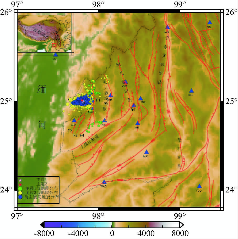 图 1 双差定位后地震的时空分布规律及区域内主要断裂分布 红色和粉色五角星代表主震1、2的位置,绿色、黄色、蓝色圆形分别代表主震1之前、主震2之后、两主震之间的地震分布.F1:苏典-盈江断裂; F2:勐弄-大石坡断裂; F3: 尖峰山-龙盆断裂; F4:小芒红断裂. Figure 1 Spatial distribution of earthquakes after relocation and the main faults in Yingjiang area Red and pink pentagram represent main shock 1 and 2,green, blue and yellow circles represent earthquakes distribution before main shock 1,after main shock2 and between two main shocks. |