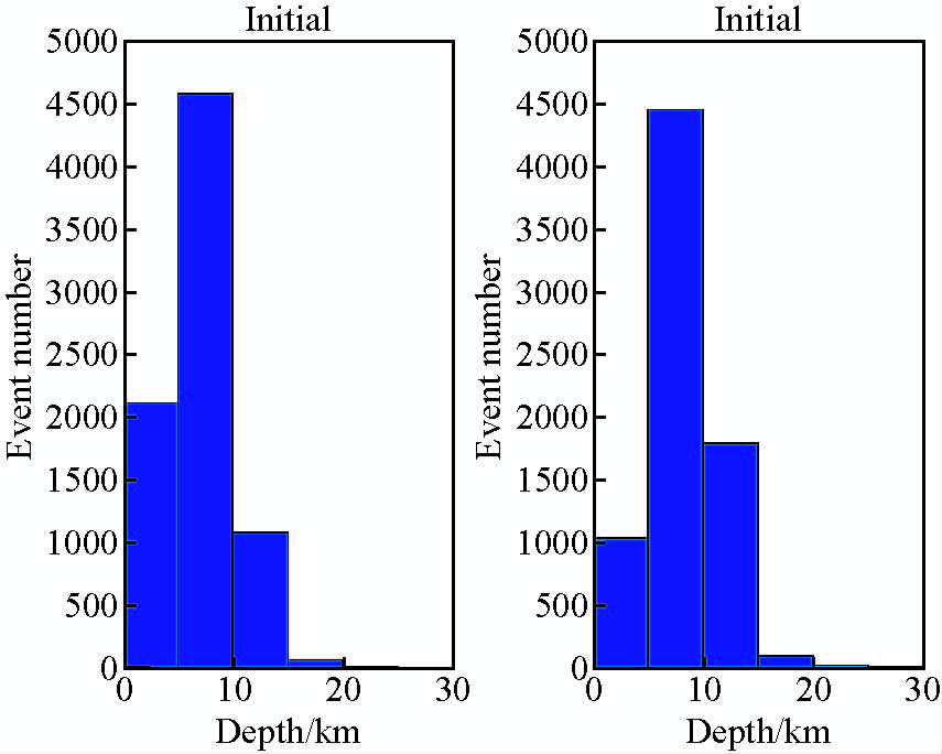 图 2 双差定位前后地震深度分布直方图 0 ~5 km深度范围内地震数目及所占比例明显减小,10~15 km深度范围内地震数目及所占比例明显增多. Figure 2 Depth histograms of earthquakes before and after relocation Number and proportion of earthquakes decreased in depth range 0~5 km and increased in depth range 10~15 km. |