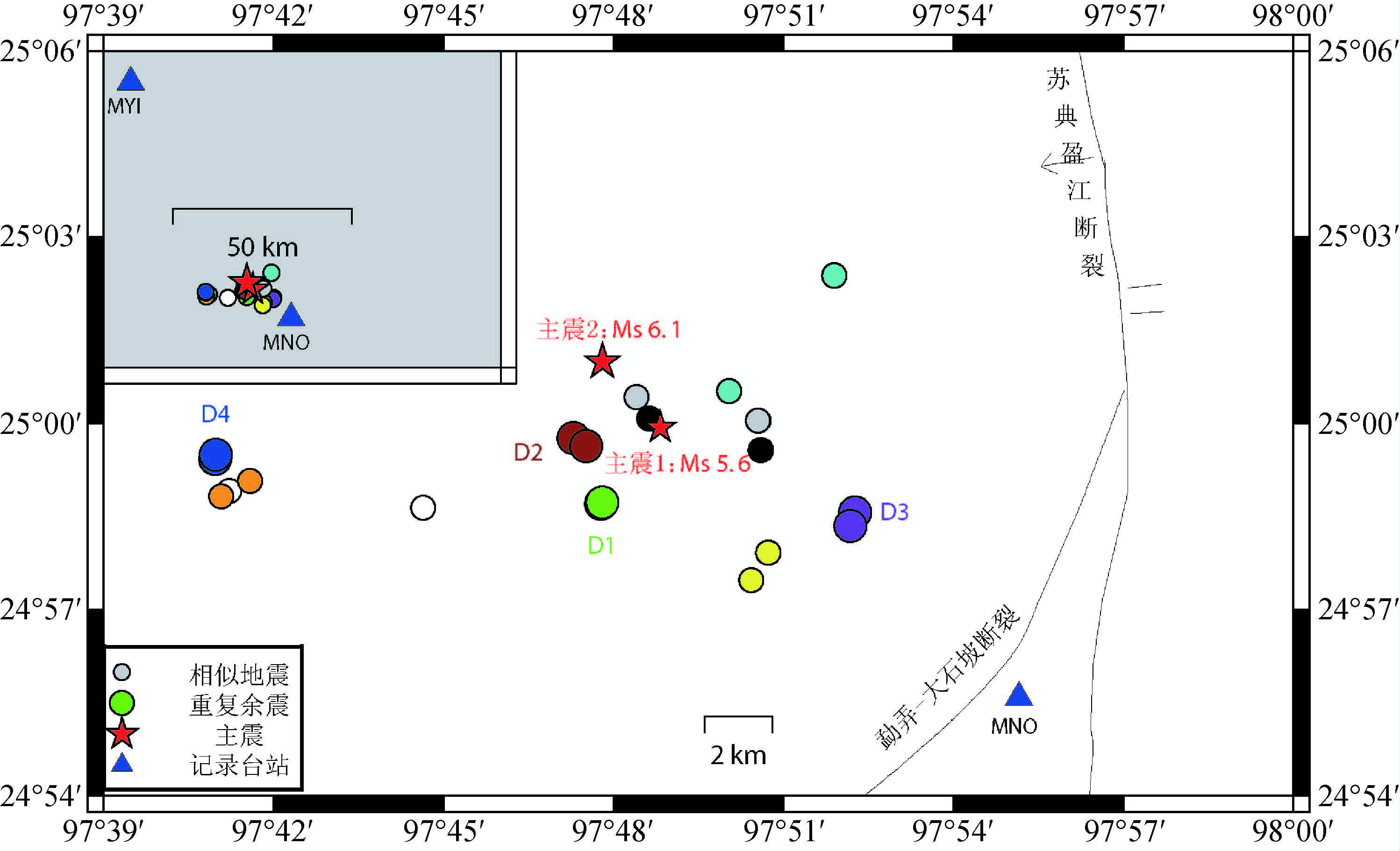 从现象上看,该地区发生的地震震中常位于盆地内部,深度浅,距人口密集区较近,破坏及其严重(房立华等,2012).本文的研究对象是盈江地区2014年发生的两次地震(以下称盈江双震),分别是发生在5月24日的MS 5.6级地震(主震1)和发生在5月30日的MS 6.1级地震(主震2),盈江双震伴随有大量余震发生(许力生等,2014),主要分布在大盈江断裂的北侧(如图 1所示).