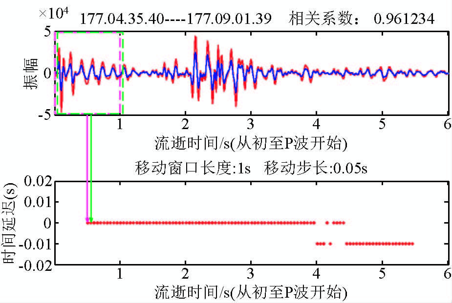 图 4 移动窗口互相关方法计算两事件的走时延迟 上图为两事件(事件1:177.04.35 .40 ;事件2:177.09.01.39)从初至P波开始的波形对比,其中紫红色和绿色矩形框内分别为第一个和第二个移动时间窗口,两个窗口内两事件的走时延迟分别为紫红色和绿色箭头所示,箭头的起点为窗口的中心时间,即流逝时间;下图为两列波形每个移动窗口内的走时延迟分布,尽管走时延迟在尾波阶段有明显的减小,但因为采样率太低而无法获取0与0.01 s之间的走时延迟,因而不能反映其线性变化趋势,图 5~8中相关信息与此图类似,后文中不再赘述. Figure 4 Calculating time delay of two events by cross correlation using shift window The above figure is the waveform comparison begin with direct p arrival of two repeating earthquakes(event1:177.04.35.40 ;event2:177.09.01.39),the purple and green rectangle box represent the first and second moving window,their delay time are showed by the purple and green arrows,the beginning point of arrows are the center time of moving windowas well as lapsetime;The below figure is the delay time variations in each move window,although delay time has reduced in coda waves,we can’t obtain time delay that between 0 and 0.01 s as well as the linear variation of delay time due to the originally low sample. Some information in Fig. 7~10 are similar to this one,we do not explain any more. |