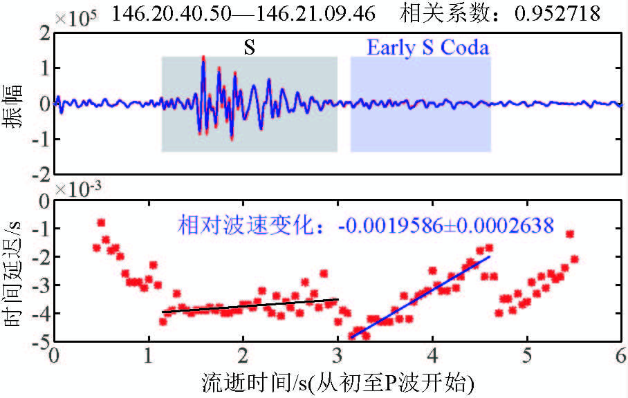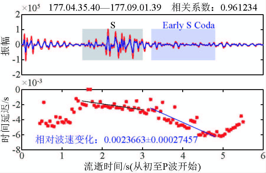 重复地震对D2同样发生在主震2之前,相比于重复地震D1,该地震对的发震时间稍晚,两个地震的时间间隔为25 h,此外在满足条件的4对重复地震中,重复地震对2与两个主震的发震位置距离最近,其在MNO台站的结果如图 6所示.尽管该重复地震对包含的两个地震事件震级略有差距,但其相关系数达到了0.96,在P波的后续部分(0~1.2 s),走时延迟分布较为复杂,走时延迟在S波及其尾波部分(1.2~4.8 s)有明显增加的趋势,且线性程度较好,可能意味着速度的降低,因此选取该部分数据计算相对波速变化,结果大约为2.25‰,在4.8~6 s的尾波范围内,走时延迟不再继续增加,呈先减小后上升的变化.而在远端的MNO台站同样没有发现走时延迟的明显变化.