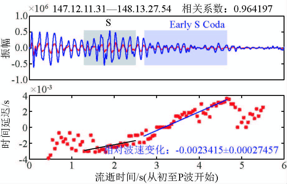 4.2结果显示,在距离主震较近的MNO台站,所有重复地震的走时延迟均有明显变化.在P波的后续部分,走时延迟变化较为复杂,可能与P波和S波不同的变化规律和PS转换波复杂的震相有关.在S波振幅较大部分,走时延迟变化不大,比较稳定,且相关系数较高,可能与S波在重复地震识别过程中参与互相关计算的高权重有关.在早期的S波尾波部分,走时延迟变化最为明显且较为线性,可能是因地壳介质的地震波速变化所引起.其中发震时间间隔最长且距离台站最近的重复地震的相对波速变化最大,约为千分之三(如图 9所示),而距离主震最近的重复地震走时延迟的变化呈现更好的线性特征,且线性持续时间最长(如图 10所示),可能与主震震源区附近地壳介质更明显的变化有关.在后续的尾波部分,走时延迟先有一个恢复过程,随后呈现与早期S波尾波类似的变化,可能与不同路径上散射体的变化不同有关.在距离主震较远的MYI台站并未监测到走时延迟的明显变化,其变化小于千分之一,与误差接近,可能是因为震源区外的地壳介质变化更加微弱,而尾波干涉结果反映的是整个传播路径上介质变化的平均结果,因而在距离主震较远的台站,这种变化并不明显.